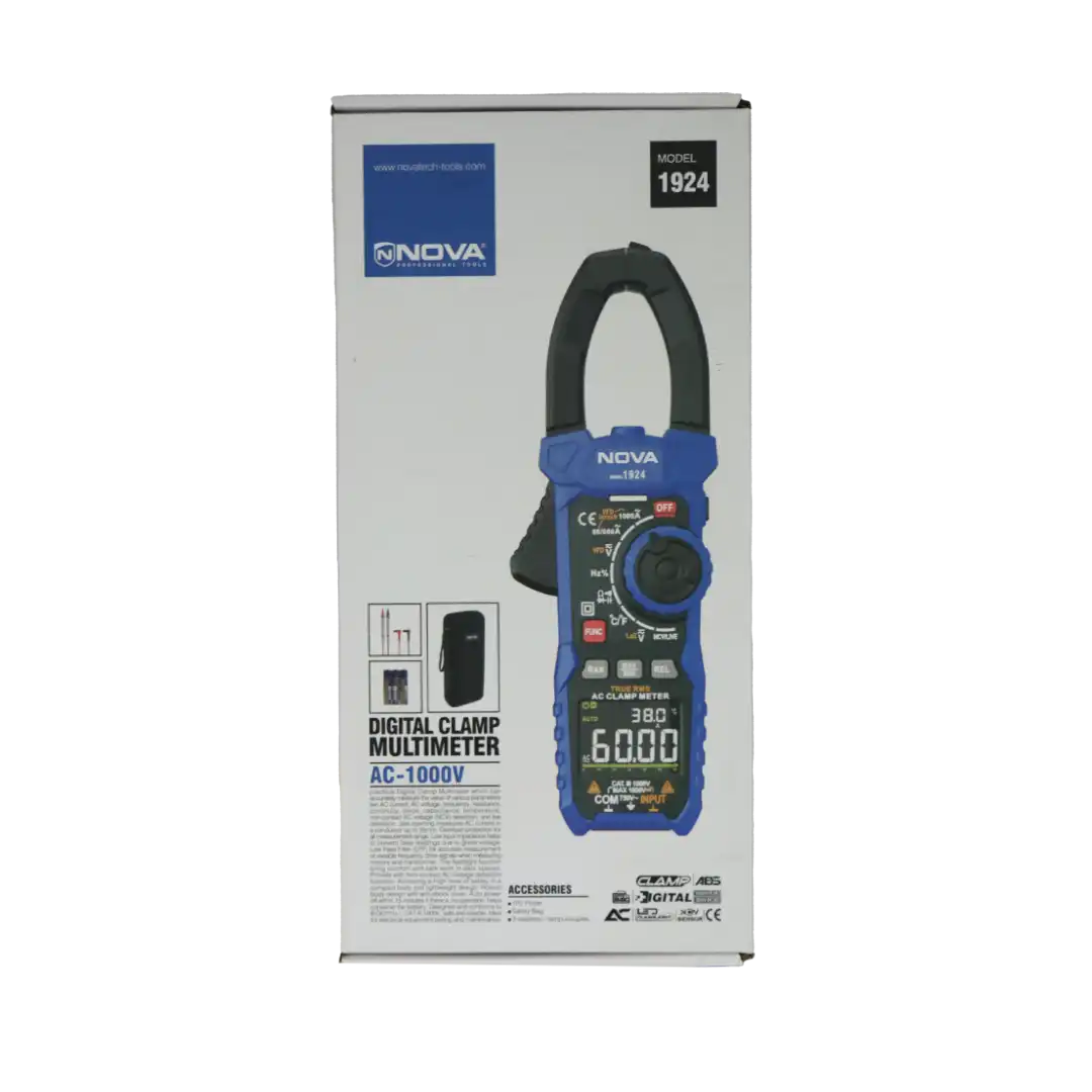 مولتی متر کلمپی AC دیجیتال 1000ولت NOVA 1924مولتی متر کلمپی دیجیتال با قابلیت اندازه گیری با بالاترین دقت پارامتری مختلف جریان AC، ولتاژ AC، فرکانس، مقاومت، دیود، خازن و دماقابلیت تستر ولتاژ به صورت غیر تماسی (NCV) , و فازمتر به صورت تماسیدارای فک های باز شونده برای تشخیص جریان در سیم و کابل های تا قطر 35 میلی متردارای سیستم محافظت در برابر جریان اضافی برای تمامی رنج های اندازه گیریسیستم امپدانس (مقاومت در برابر جریان متناوب) ورودی پایین جهت جلوگیری از تاثیر ولتاژهای القایی بر روی اندازه گیری و خوانش اعدادامکان تشخیص ولتاژ AC، بدون نیاز تماس مستقیم با کابل با رسانای مورد نظرطراحی سبک با ابعاد مناسب بدنه دارای بالاترین سطح ایمنیاستفاده از فیلتر پایین گذر (LFP) برای اندازه گیری دقیق انواع سیگنال های درایو موتور و ترانسفورماتورهابدنه مقاوم در برابر ضربه ساخته شده از متریال با مقاومت بالادارای سیستم خاموشی خودکار در زمان عدم استفاده از آن جهت فزایش طول باتریمناسب برای تست انواع تجهیزلت الکترونیکی و تعمیرات در بخش الکترونیکطراحی و تولید شده مطابق با استاندارد CAT III 1000V، IEC601010 با بالاترین سطح ایمنی متعلقات: